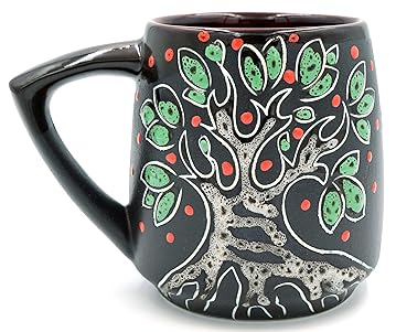 Created from eco-friendly pottery clay, this colorful mug features a hand painted tree of life design on the front, is dishwasher and microwave safe, and holds around 14oz.